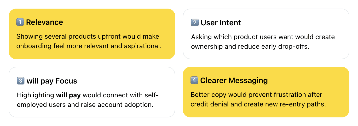 These findings reinforced the need to offer new entry points beyond credit and build more trust within the onboarding experience.