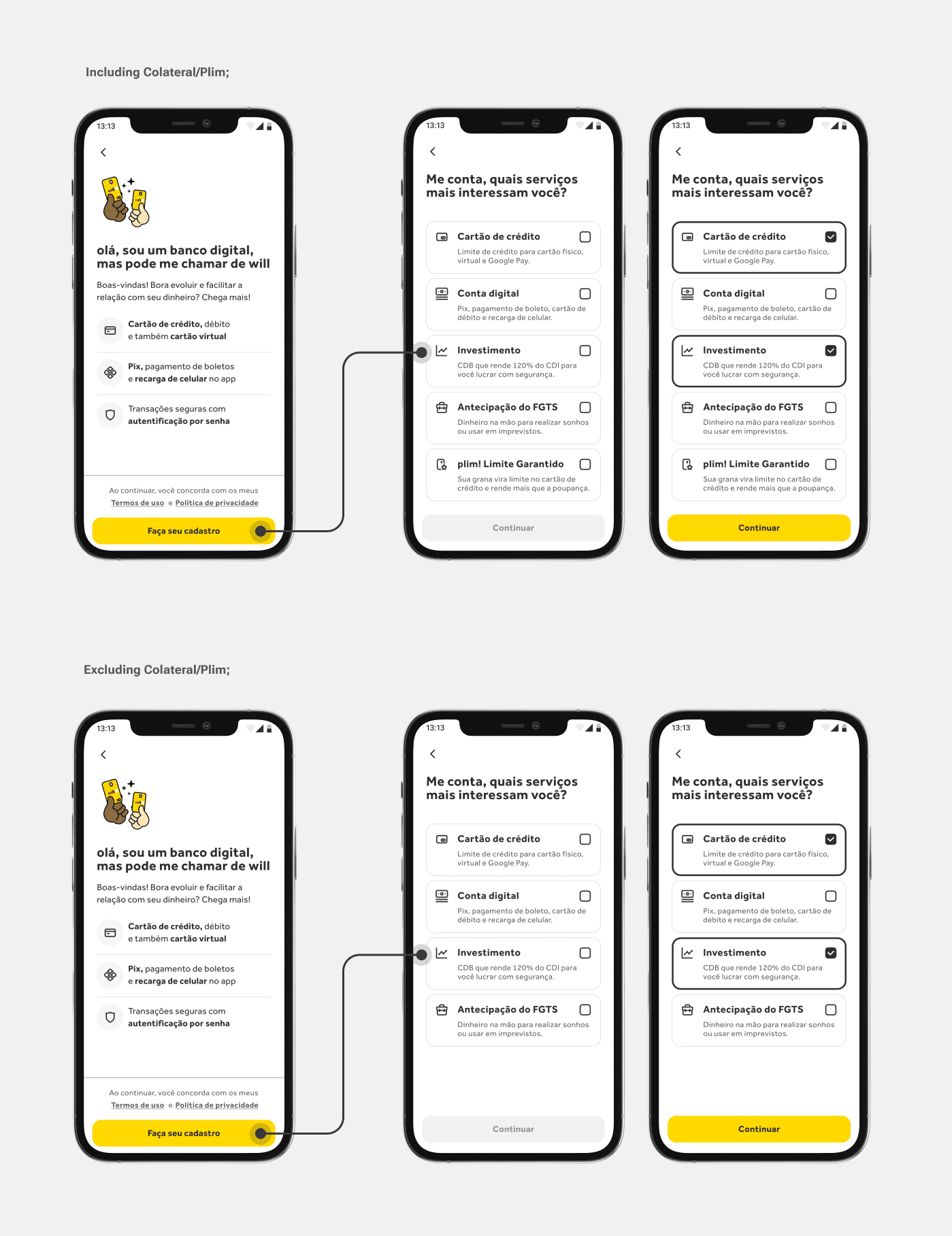 People could choose between Credit Card, Account, FGTS, Investments, and will pay, but at this stage, the selection didn’t change the journey yet.