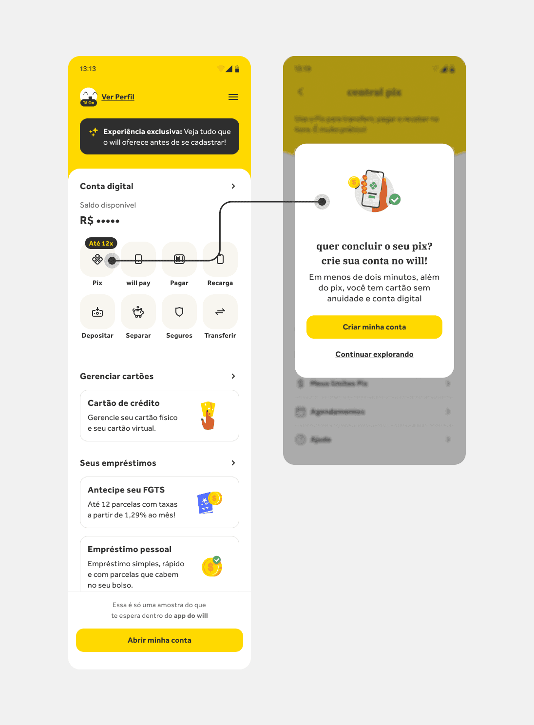 Digital Account — emphasizing other products available inside the app, such as will pay, investments, and savings;