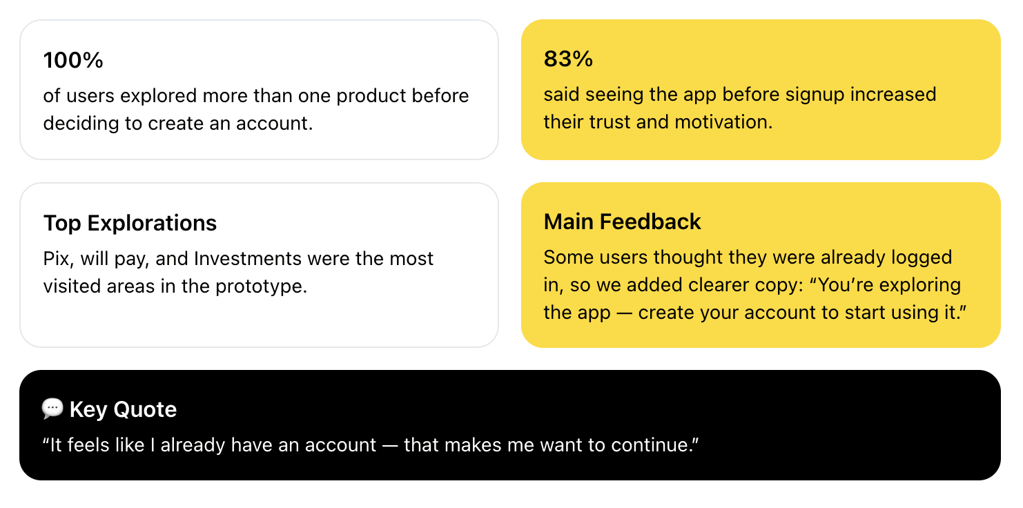 This reinforced the need to test social proof and trust messages in onboarding;Expectation of full access